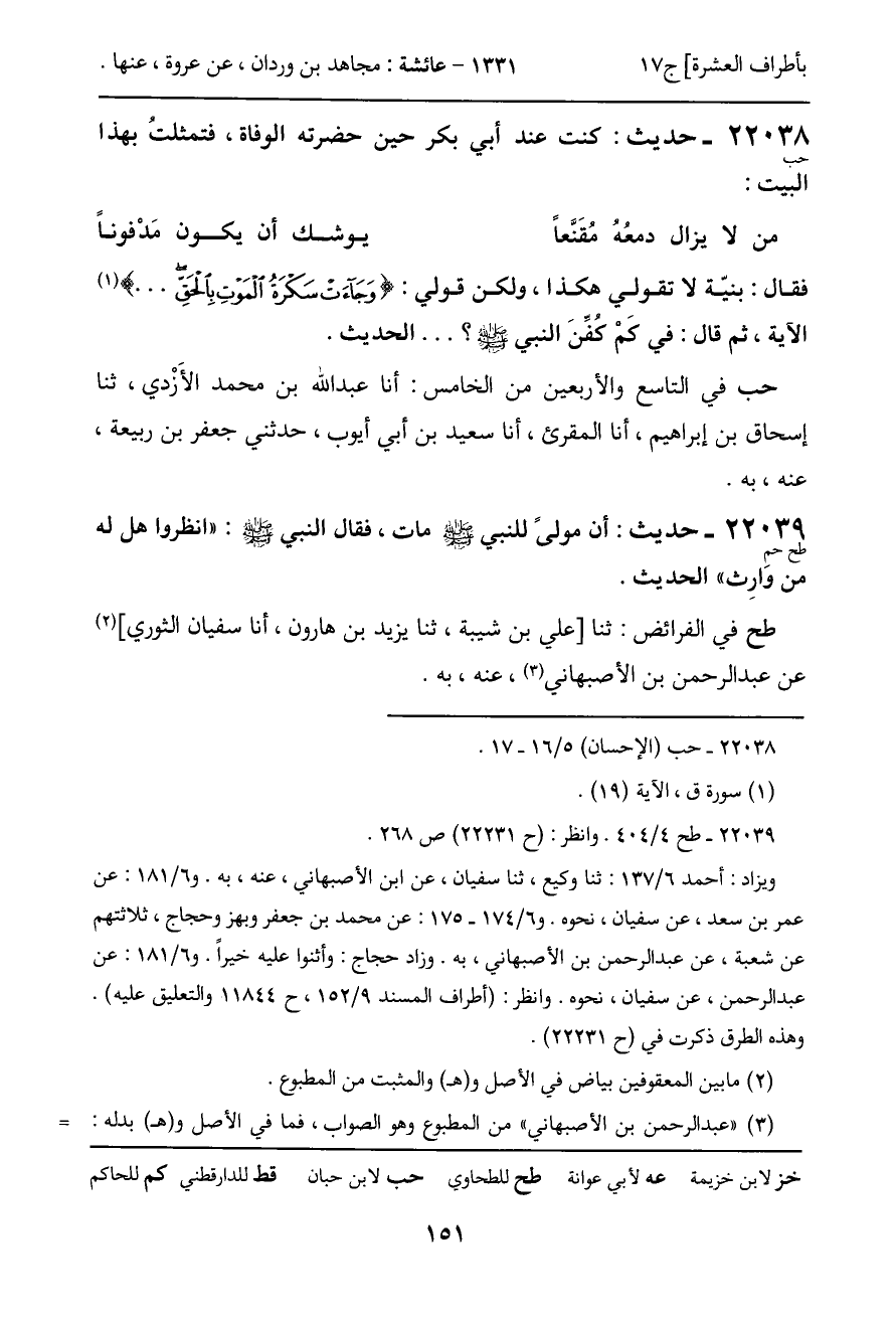 22038 - حديث (حب) : كنت عند أبي بكر حين حضرته الوفاة، فتمثلت بهذا البيت:
