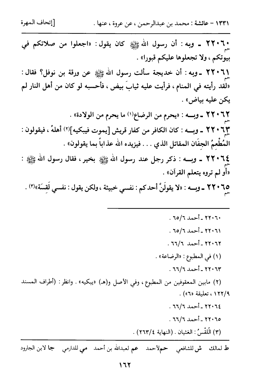 22061 - وبه (حم) : أن خديجة سألت رسول الله - صَلَّى اللَّهُ عَلَيْهِ وَسَلَّمَ - عن ورقة بن نوفل؟ فقال: "لقد رأيته في المنام، فرأيت عليه ثيابَ بيض، فأحسبه لو كان من أهل النار لم يكن عليه بياض".