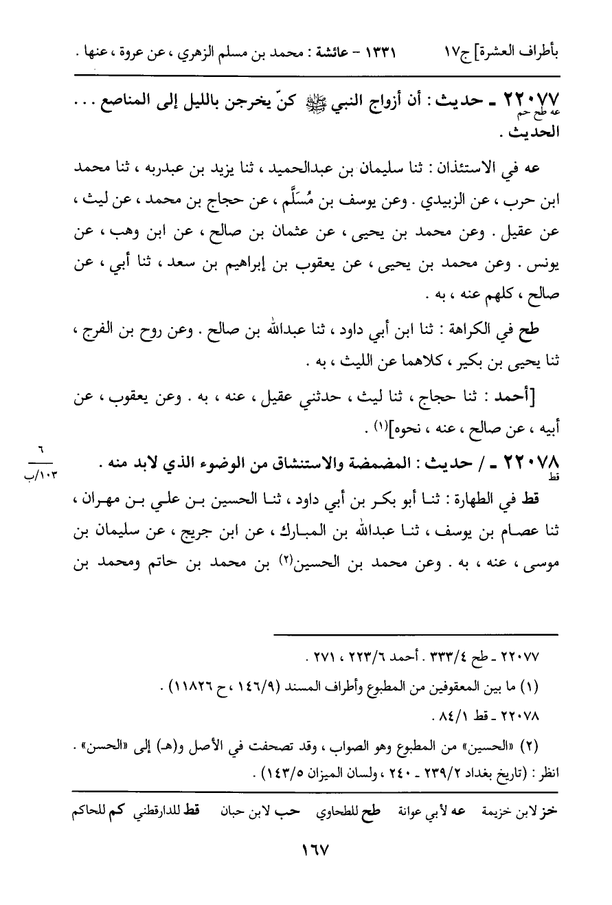 قط في الطهارة: ثنا أبو بكر بن أبي داود، ثنا الحسين بن علي بن مهران، ثنا عصام بن يوسف، ثنا عبد الله بن المبارك، عن ابن جريج، عن سليمان بن موسى، عنه، به. وعى محمد بن الحسين بن محمد بن حاتم ومحمد بن