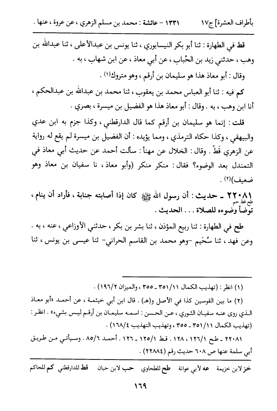 قط في الطهارة: ثنا ابن منيع، ثنا عثمان بن أبي شيبة، ثنا طلحة بن يحيى، عن يونس، عن الزهري، عن أبي سلمة أو عن عروة، عن عائشة، به. وعن أبي بكر النيسابوري، عن محمد بن إسماعيل الصائغ، عن إبراهيم بن المنذر، عن أبي ضمرة [عن يونس] ، عن ابن شهاب، عن عروة وأبي سلمة، كلاهما عن عائشة، نحوه.
