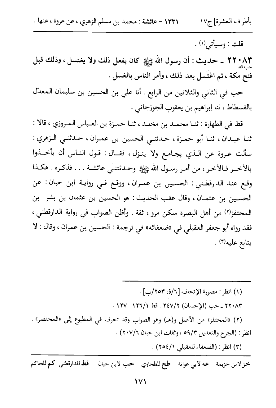 قط في الطهارة: ثنا محمد بن مخلد، ثنا حمزة بن العباس المروزي، قالا: ثنا عبدان، ثنا أبو حمزة، حدثني الحسين بن عمران، حدثني الزهري: سألت عروة عن الذي يجامع ولا ينزل، فقال: قول الناس أن يأخذوا بالآخر فالآخر، من أمر رسول الله - صَلَّى اللَّهُ عَلَيْهِ وَسَلَّمَ - وحدثتني عائشة ... فذكره. هكذا وقع عند الدارقطني: الحسين بن عمران، ووقع في رواية ابن حبان: عن الحسين بن عثمان، وقال عقب الحديث: هو الحسين بن عثمان بن بشر بن المحتفز من أهل البصرة سكن مرو، ثقة. وأظن الصواب في رواية الدارقطني، فقد رواه أبو جعفر العقيلي في "ضعفائه" في ترجمة: الحسين بن عمران، وقال: لا يتابع عليه.