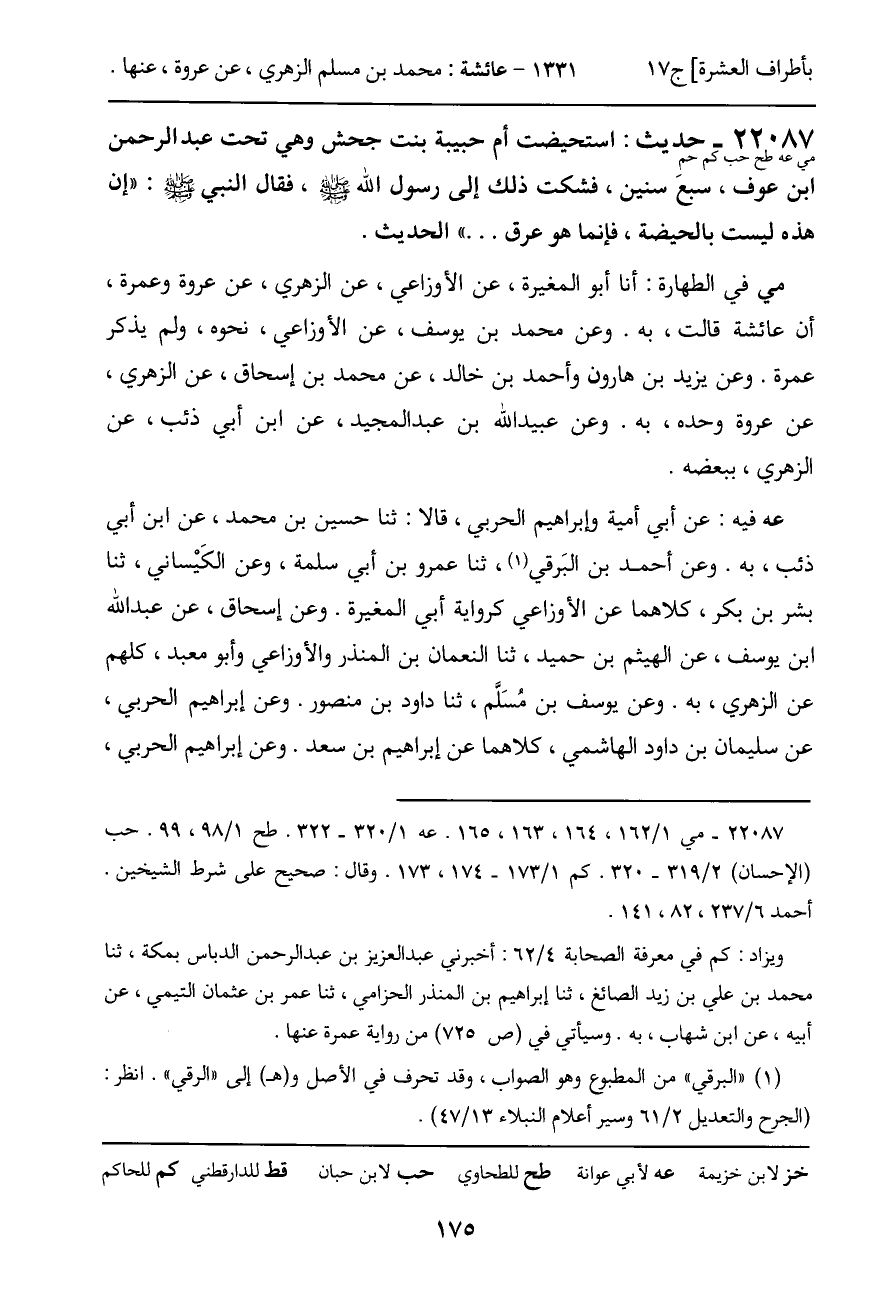 22087 - حديث (مي عه طح حب كم حم) : استحيضت أم حبيبة بنت جحش وهي تحت عبد الرحمن ابن عوف، سبع سنين، فشكت ذلك إلى رسول الله - صَلَّى اللَّهُ عَلَيْهِ وَسَلَّمَ -، فقال النبي - صَلَّى اللَّهُ عَلَيْهِ وَسَلَّمَ -: "إن هذه ليست بالحيضة، فإنما هو عرق ... " الحديث.