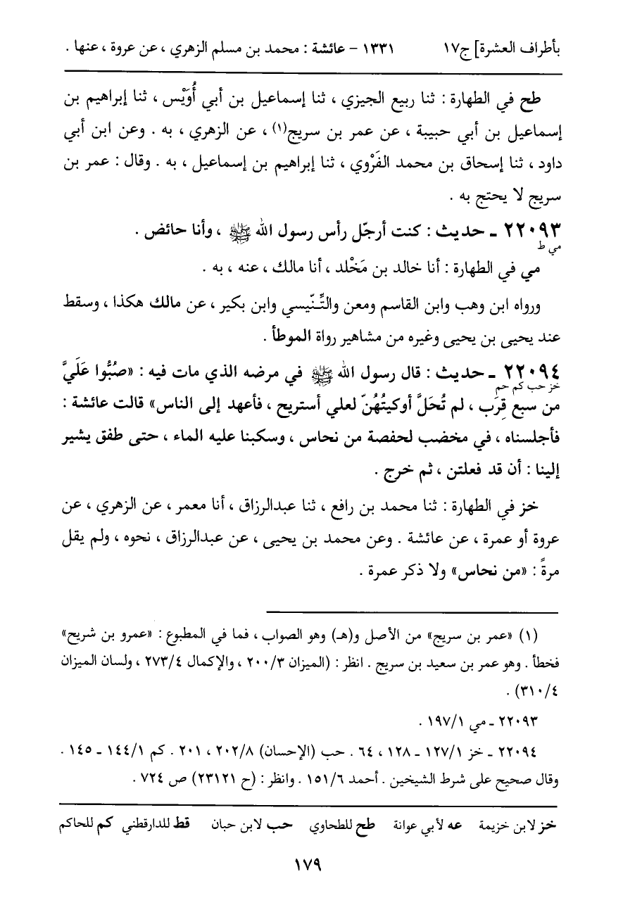 خز في الطهارة: ثنا محمد بن رافع، ثنا عبد الرزاق، أنا معمر، عن الزهري، عن عروة أو عمرة، عن عائشة. وعن محمد بن يحيى، عن عبد الرزاق، نحوه، ولم يقل مرة: "من نحاس" ولا ذكر عمرة.