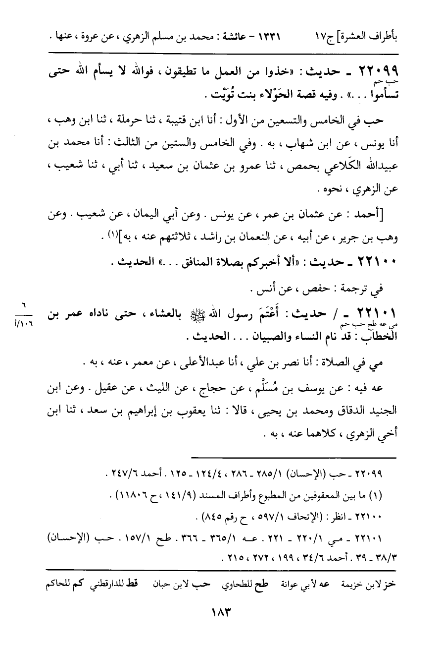 22099 - حديث (حب حم) : "خذوا من العمل ما تطيقون، فوالله لا يسأم الله حتى تسأموا ... ". وفيه قصة الحَوْلاء بنت تُوَيْت.