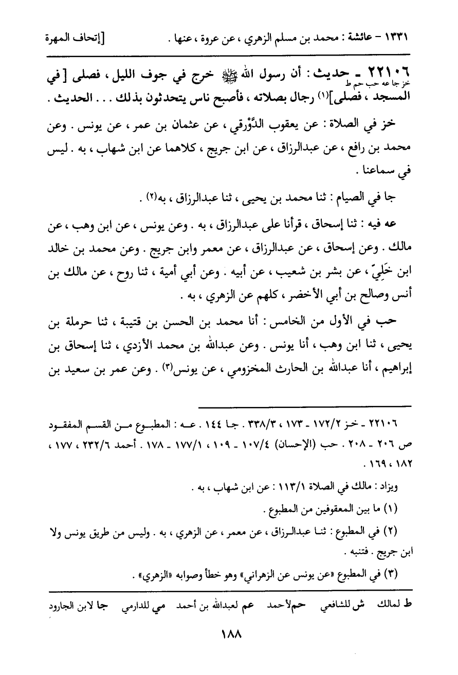 [أحمد: عن عبد الرزاق، عن معمر. وعن عثمان بن عمر، عن يونس. وعن عبد الرحمن، عن مالك. وعن يزيد، عن سفيان بن حسين. وعن عبد الرزاق وابن بكر، عن ابن جريج، خمستهم عن الزهري، به] .