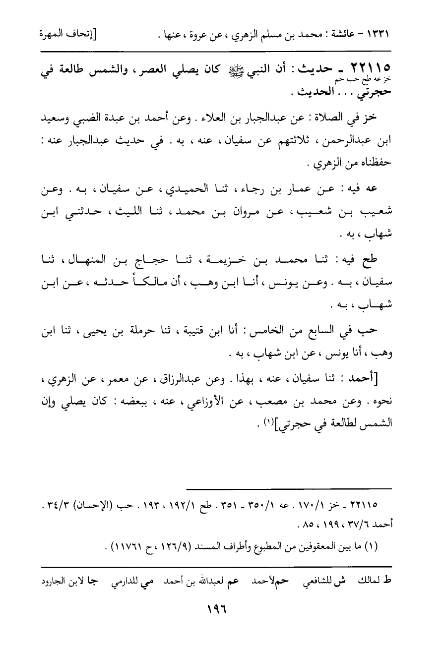 [أحمد: ثنا سفيان، عنه، بهذا وعن عبد الرزاق، عن معمر، عن الزهري، نحوه. وعن محمد بن مصعب، عن الأوزاعي، عنه، ببعضه. كان يصلي وإن الشمس لطالعة في حجرتي] .