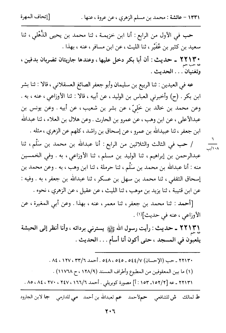 22131 - حديث (عه حم) : رأيت رسول الله - صَلَّى اللَّهُ عَلَيْهِ وَسَلَّمَ - يسترني بردائه، وأنا أنظر إلى الحبشة يلعبون في المسجد، حتى أكون أنا أسأم ... الحديث.