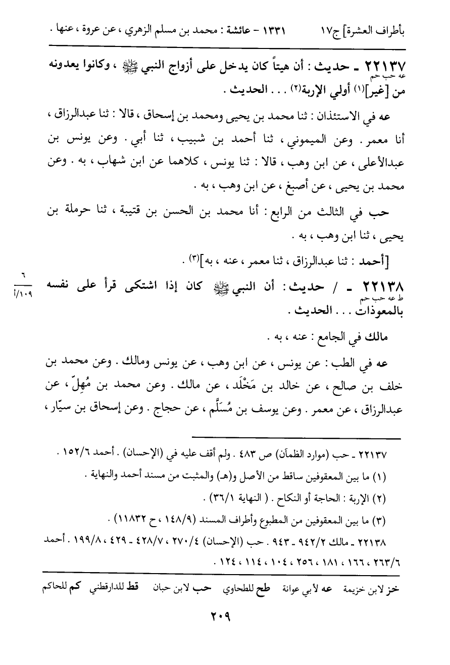 حب في الثاني عشر من الخامس: أنا عمر بن سعيد بن سنان، أنا أحمد بن أبي بكر، عن مالك، به. وفيه: عن عبد الله بن محمد الأزدي، ثنا إسحاق بن إبراهيم، أنا النضر بن شُمَيْل، ثنا سعيد بن أبي أيوب. وعن ابن قتيبة، ثنا يزيد بن موهب، حدثني المُفَضَّل بن فضالة، كلاهما عن عقيل، نحوه. وفي الثاني من الأول، وفي الثامن والأربعين من الخامس: أنا ابن قتيبة، ثنا حرملة، ثنا ابن وهب، أنا يونس، به نحوه.