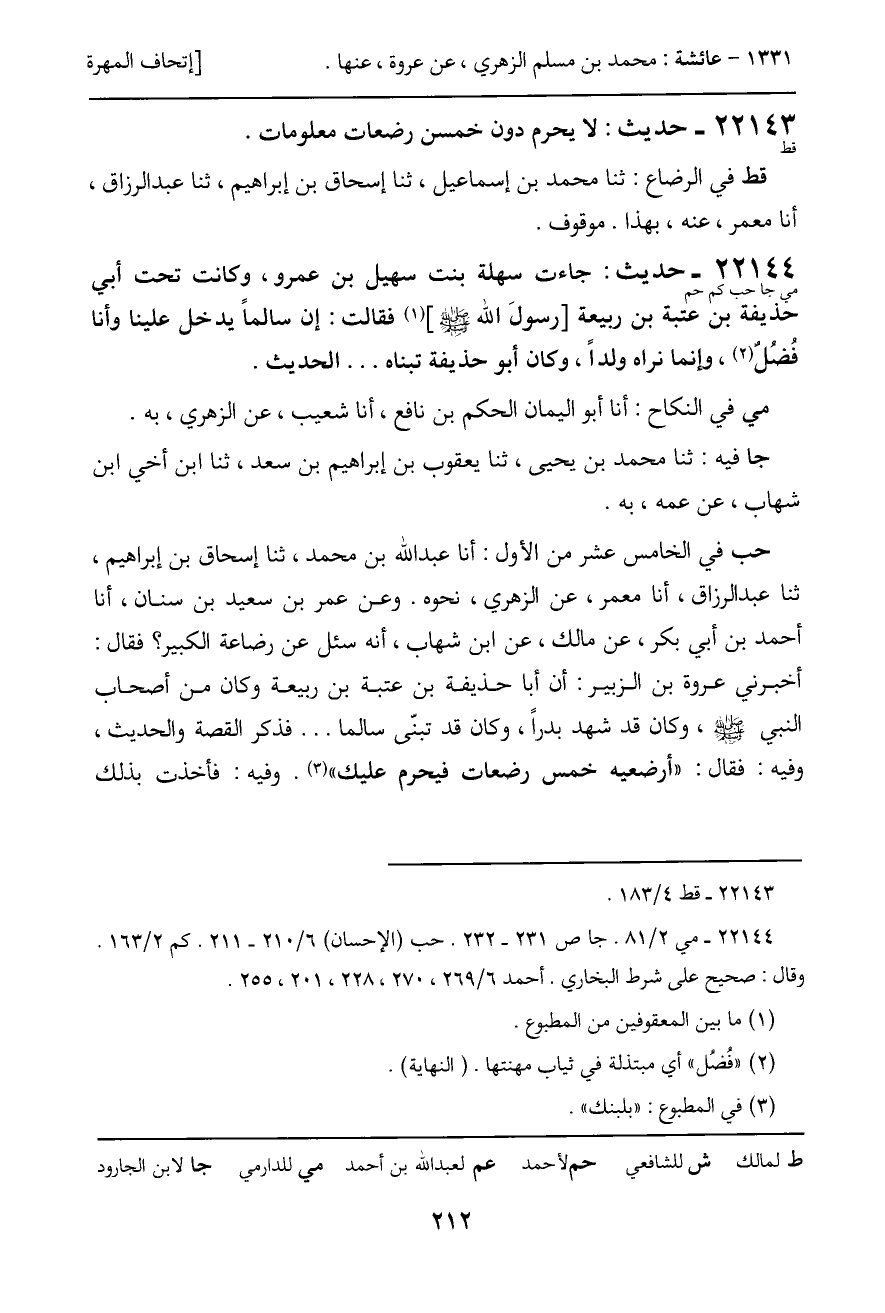 حب في الخامس عشر من الأول: أنا عبد الله بن محمد، ثنا إسحاق بن إبراهيم، ثنا عبد الرزاق، أنا معمر، عن الزهري، نحوه. وعن عمر بن سعيد بن سنان، أنا أحمد بن أبي بكر، عن مالك، عن ابن شهاب، أنه سئل عن رضاعة الكبير؟ فقال: أخبرني عروة بن الزبير: أن أبا حذيفة بن عتبة بن ربيعة وكان من أصحاب النبي - صَلَّى اللَّهُ عَلَيْهِ وَسَلَّمَ -، وكان قد شهد بدراً، وكان قد تبنّى سالما ... فذكر القصة والحديث، وفيه: فقال: "أرضعيه خمس رضعات فيحرم عليك" وفيه: فأخذت بذلك