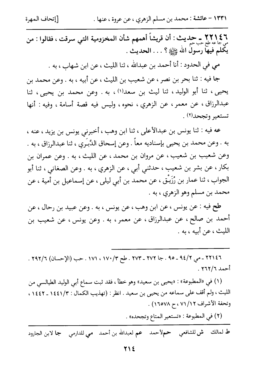 جا فيه: ثنا بحر بن نصر، عن شعيب بن الليث، عن أبيه، به. وعن محمد بن يحيى، ثنا أبو الوليد، ثنا ليث بن سعد، به. وعن محمد بن يحيى، ثنا عبد الرزاق، عن معمر، عن الزهري، نحوه، وليس فيه قصة أسامة، وفيه: أنها تستعير وتجحد.