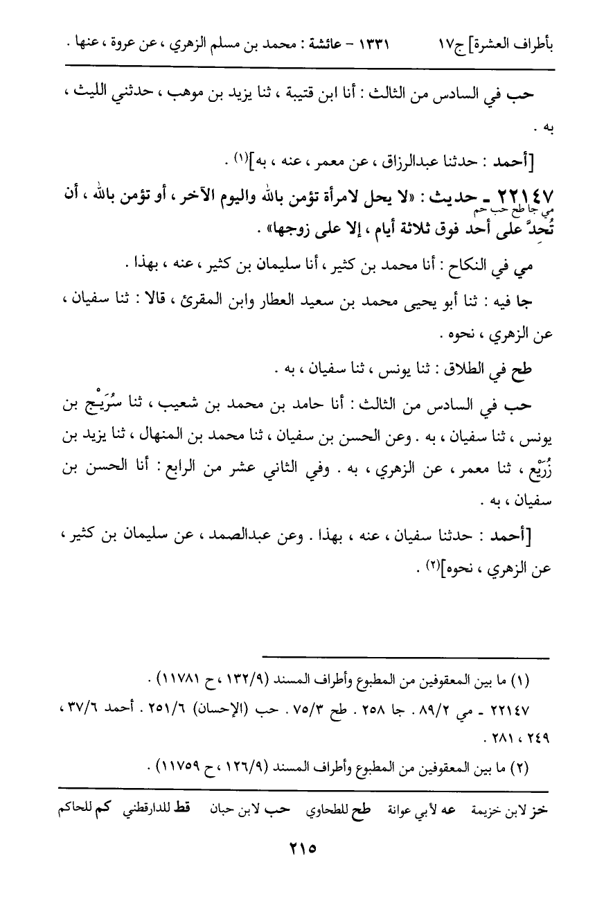 22147 - حديث (مي جا طح حب حم) : "لا يحل لامرأة تؤمن بالله واليوم الآخر، أو تؤمن بالله، أن تحِدَّ على أحد فوق ثلاثة أيام، إلا على زوجها".