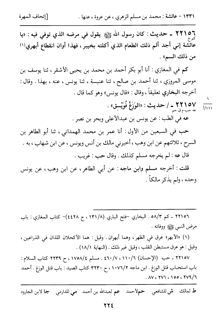 22156 - حديث (كم خ) : كان رسول الله - صَلَّى اللَّهُ عَلَيْهِ وَسَلَّمَ - يقول في مرضه الذي توفى فيه: "يا عائشة إني أجد ألم ذلك الطعام الذي أكلته بخيبر، فهذا أوان انقطاع أبهري من ذلك السم".