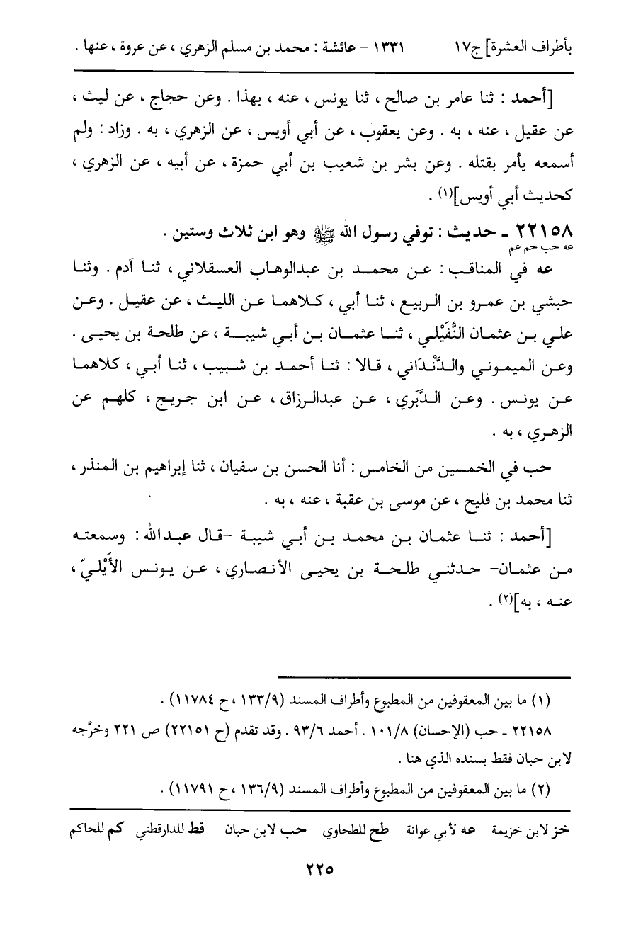 عه في المناقب: عن محمد بن عبد الوهاب العسقلاني، ثنا آدم. وثنا حبشي بن عمرو بن الربيع، ثنا أبي، كلاهما عن الليث، عن عقيل. وعن علي بن عثمان النفَيْلي، ثنا عثمان بن أبي شيبة، عن طلحة بن يحيى.