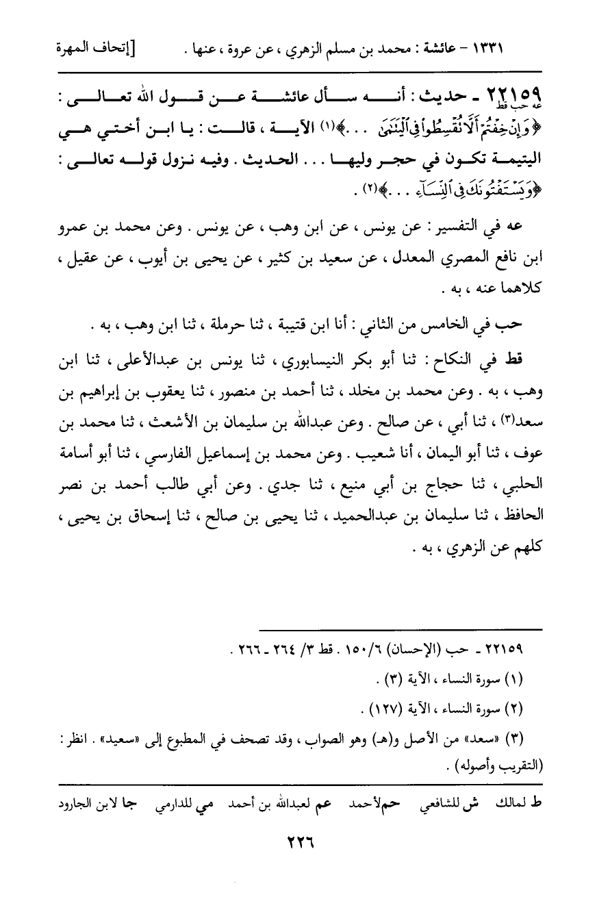 22159 - حديث (عه حب قط) : أنه سأل عائشة عن قول الله تعالى: (وَإِنْ خِفْتُمْ أَلَّا تُقْسِطُوا فِي الْيَتَامَى ... ) الآية، قالت: يا ابن أختي هي اليتيمة تكون في حجر وليها ... الحديث. وفيه نزول قوله تعالى: (وَيَسْتَفْتُونَكَ فِي النِّسَاءِ ... ) .