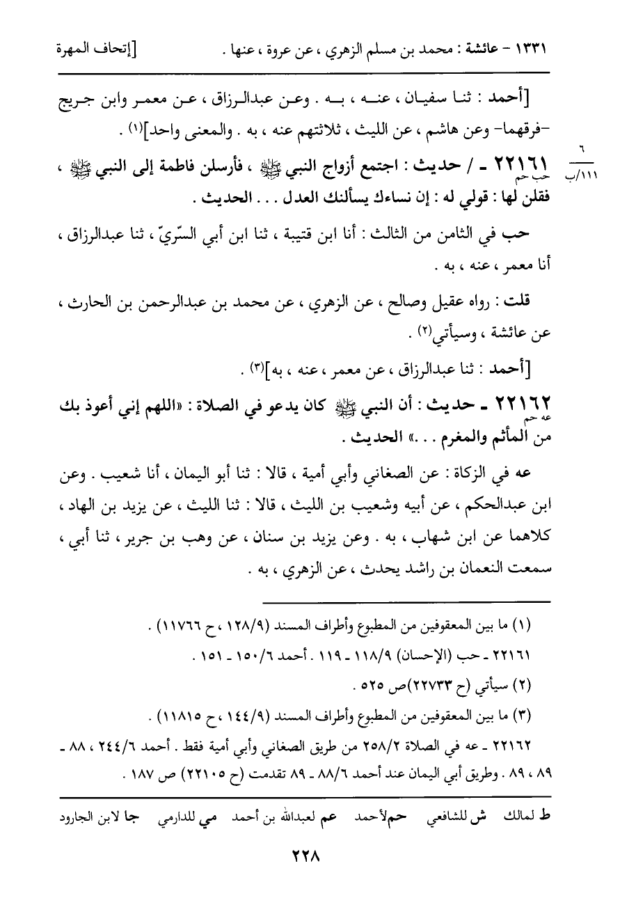 22161 - حديث (حب حم) : اجتمع أزواج النبي - صَلَّى اللَّهُ عَلَيْهِ وَسَلَّمَ -، فأرسلن فاطمة إلى النبي - صَلَّى اللَّهُ عَلَيْهِ وَسَلَّمَ -، فقلن لها: قولي له: إن نساءك يسألنك العدل ... الحديث.