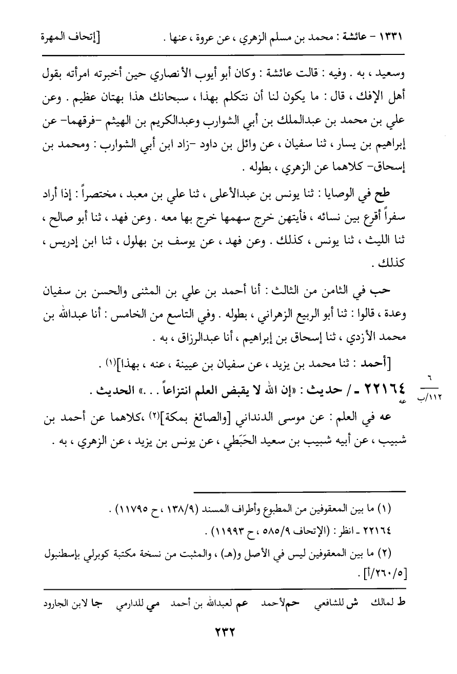 22164 - حديث (عه) : "إن الله لا يقبض العلم انتزاعاً ... " الحديث.