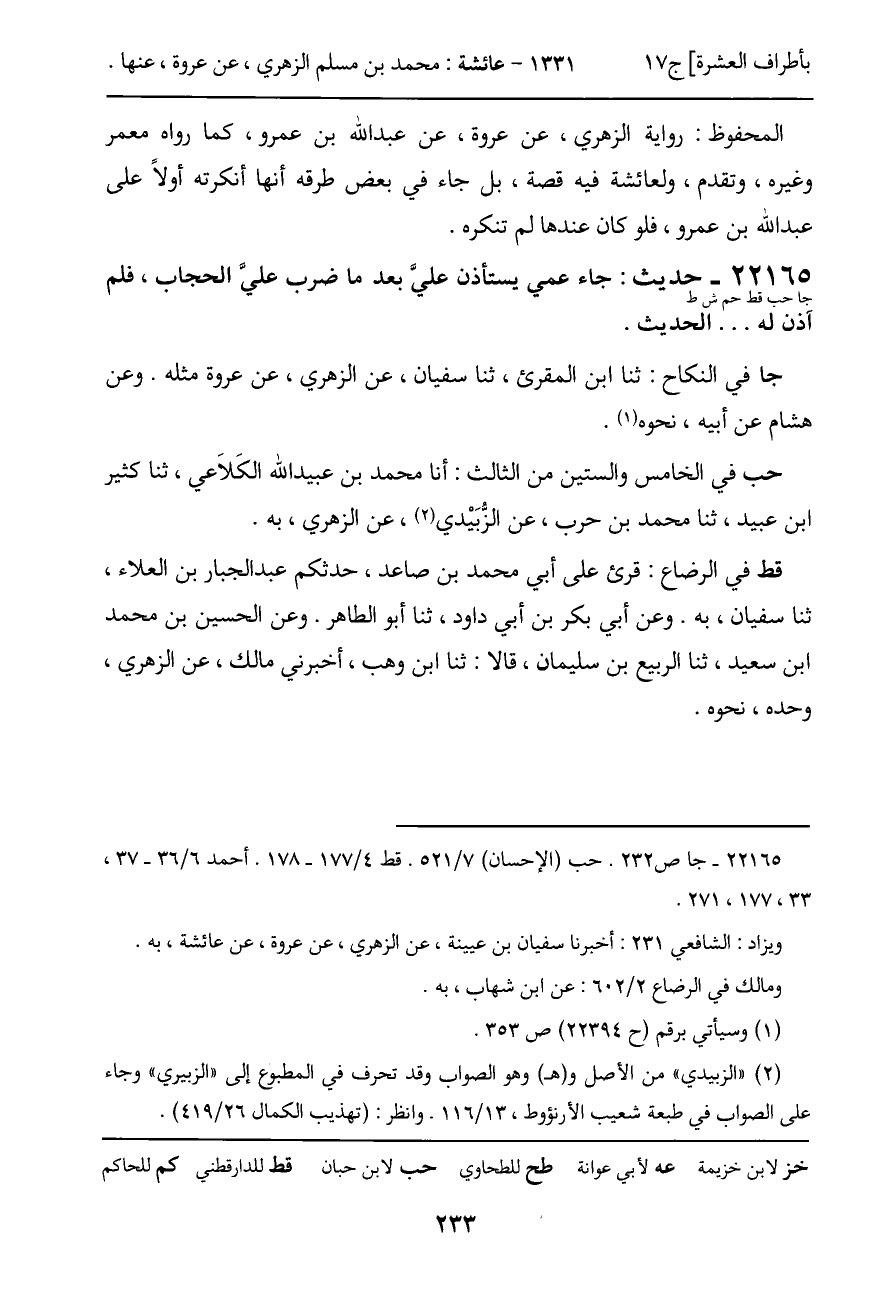 22165 - حديث (جا حب قط حم ش ط) : جاء عمي يستأذن عليَّ بعد ما ضرب عليَّ الحجاب، فلم آذن له ... الحديث.