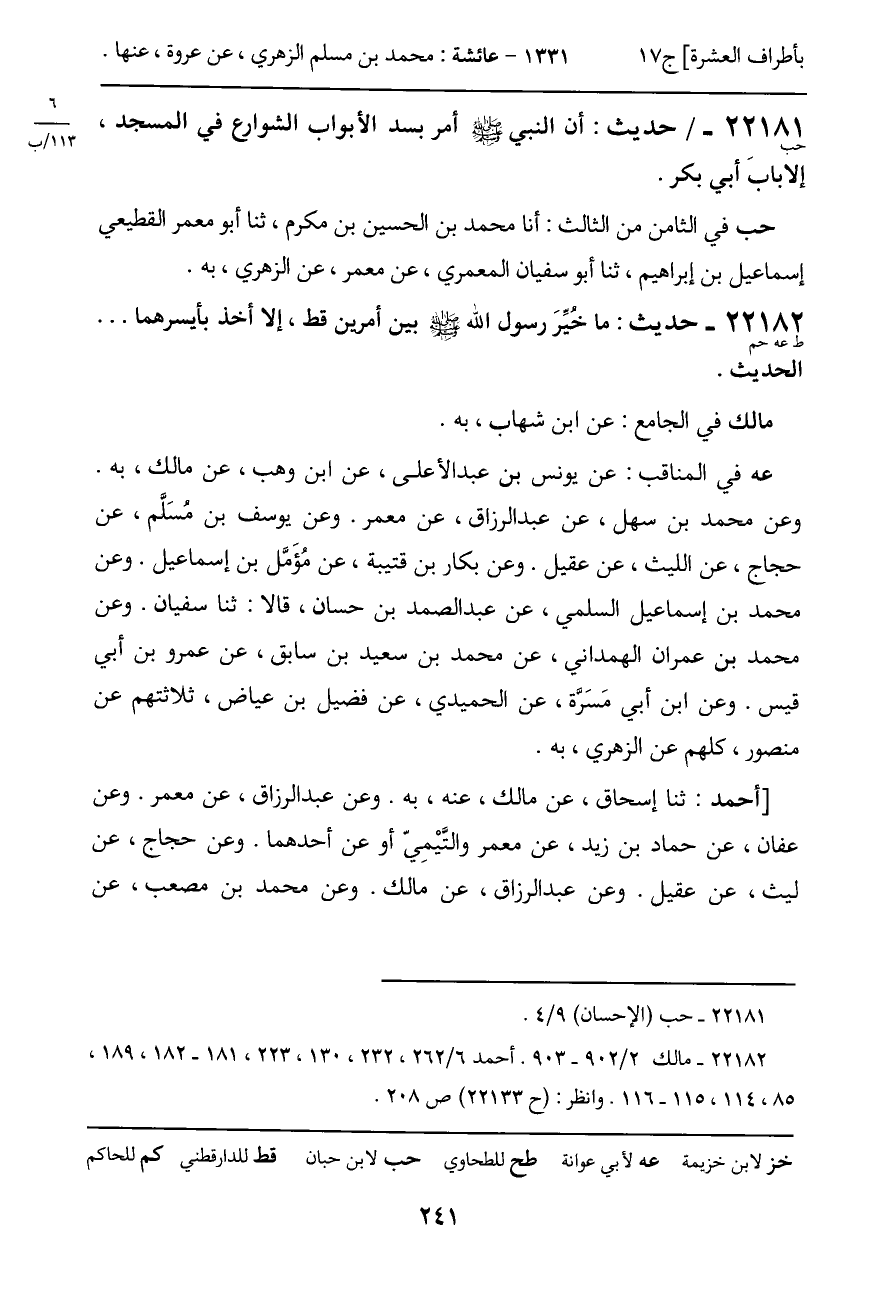 22181 - حديث (حب) : أن النبي - صَلَّى اللَّهُ عَلَيْهِ وَسَلَّمَ - أمر بسد الأبواب الشوارع في المسجد، إلا بابَ أبي بكر.
