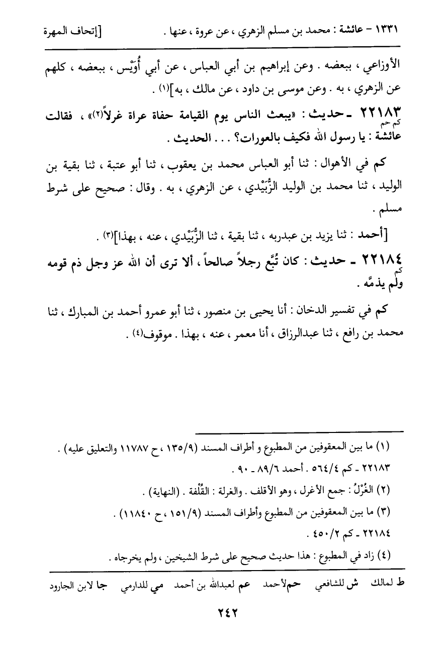 22183 - حديث (كم حم) : "يبعث الناس يوم القيامة حفاة عراة غرلاً"، فقالت عائشة: يا رسول الله فكيف بالعورات؟ ... الحديث.