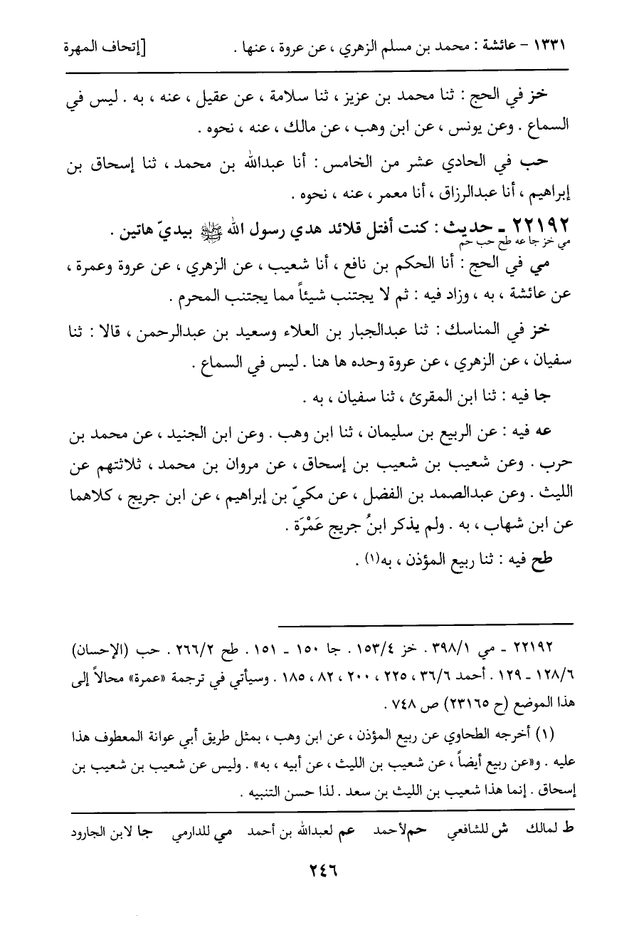 خز في المناسك: ثنا عبد الجبار بن العلاء وسعيد بن عبد الرحمن، قالا: ثنا سفيان، عن الزهري، عن عروة وحده ها هنا. ليس في السماع.