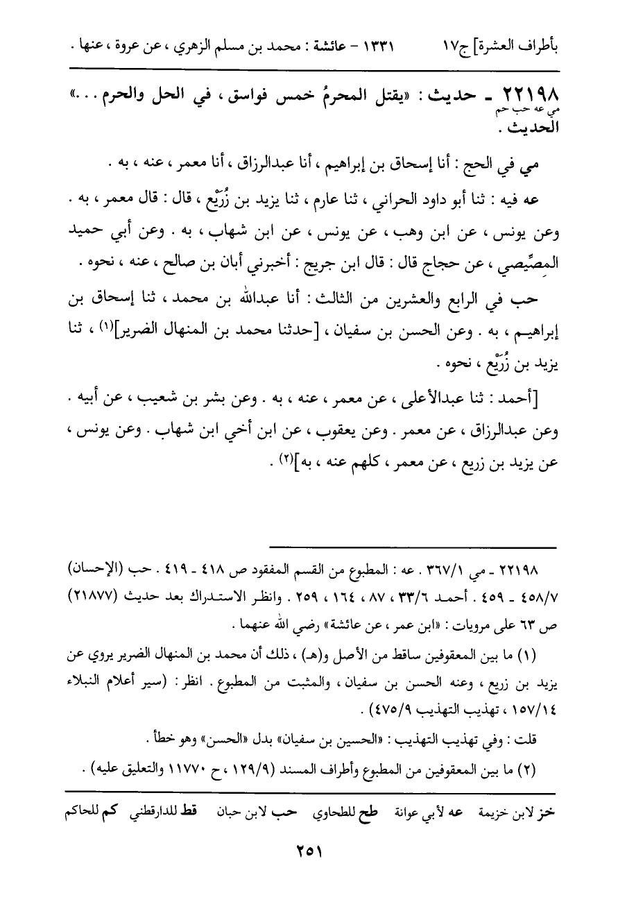 حب في الرابع والعشرين من الثالث: أنا عبد الله بن محمد، ثنا إسحاق بن إبراهيم، به. وعن الحسن بن سفيان، [حدثنا محمد بن المنهال الضرير] ، ثنا يزيد بن زُرَيْع، نحوه.