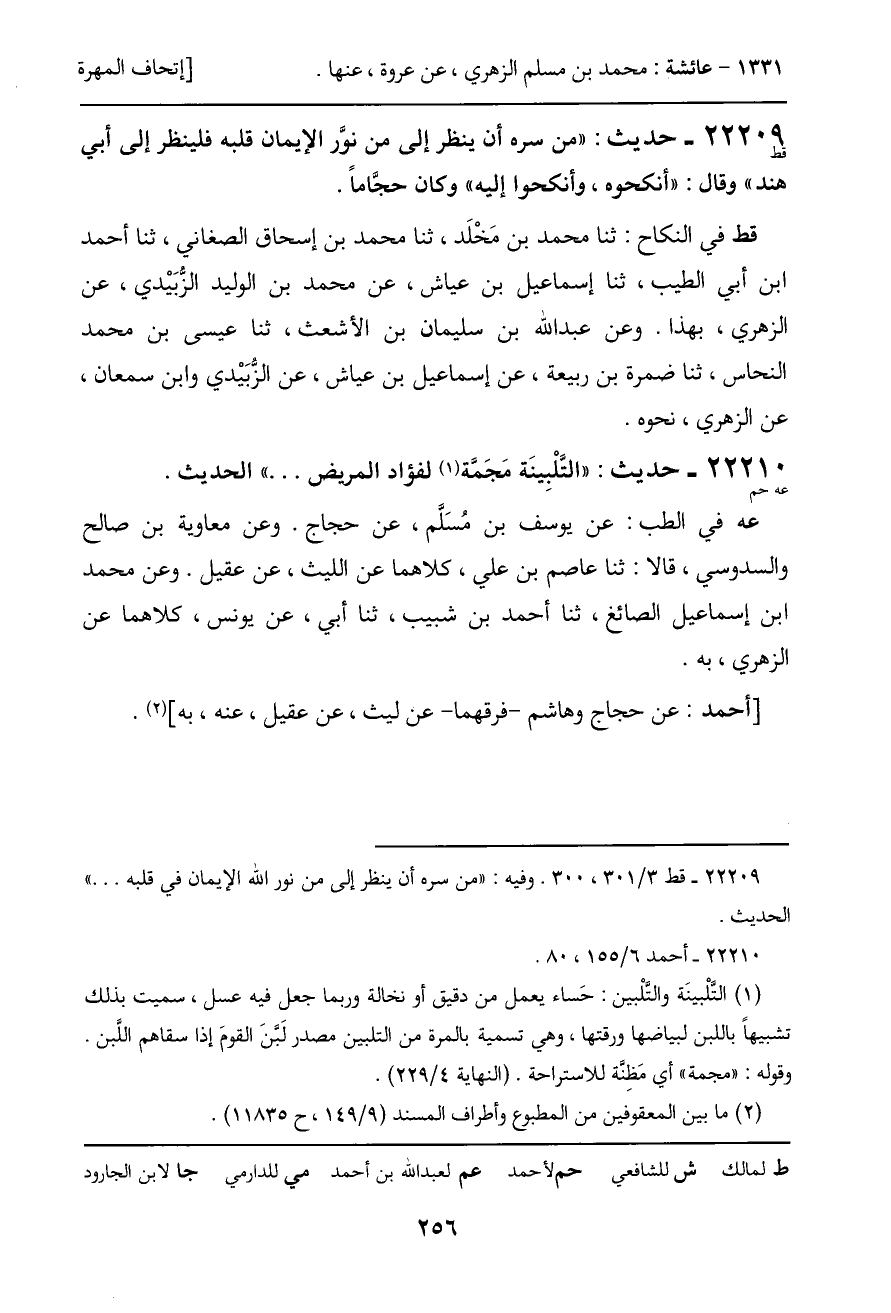 22210 - حديث (عه حم) : "التلْبينَة مَجَمَّة لفؤاد المريض ... " الحديث.
