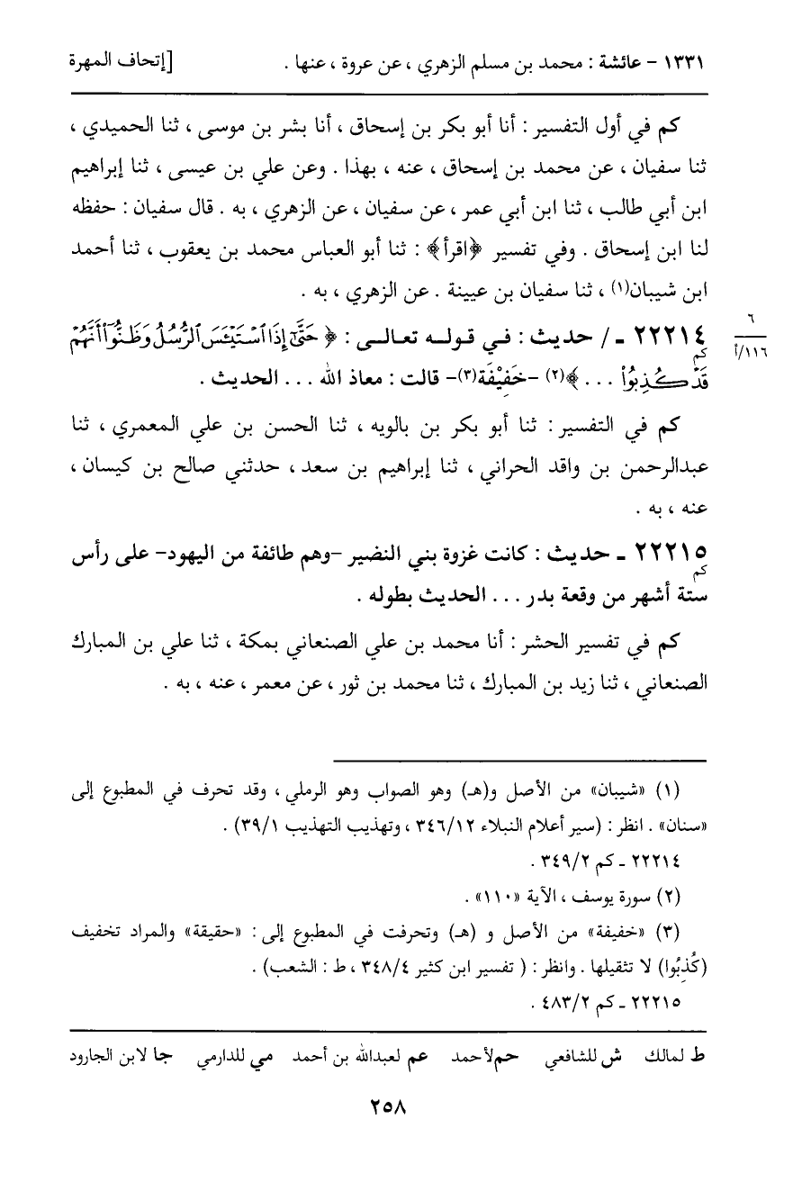22215 - حديث (كم) : كانت غزوة بني النضير - وهم طائفة من اليهود - على رأس ستة أشهر من وقعة بدر ... الحديث بطوله.