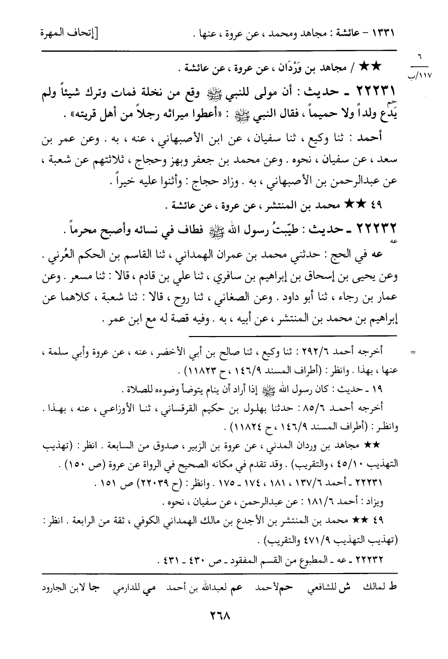 22232 - حديث (عه) : طيّبتُ رسول الله - صَلَّى اللَّهُ عَلَيْهِ وَسَلَّمَ - فطاف في نسائه وأصبح محرماً.