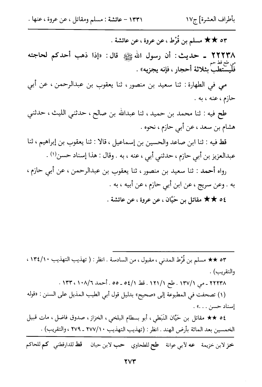 22238 - حديث (مي طح قط حم) : أن رسول الله - صَلَّى اللَّهُ عَلَيْهِ وَسَلَّمَ - قال: "إذا ذهب أحدكم لحاجته فليستطب بثلاثة أحجار، فإنه يجزيه".