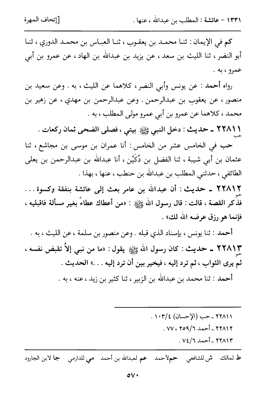حب في الخامس عشر من الخامس: أنا عمران بن موسى بن مجاشع، ثنا عثمان بن أبي شيبة، ثنا الفضل بن دكين، أنا عبد الله بن عبد الرحمن بن يعلى الطائفي، حدثني المطلب بن عبد الله بن حنطب، عنها، بهذا.