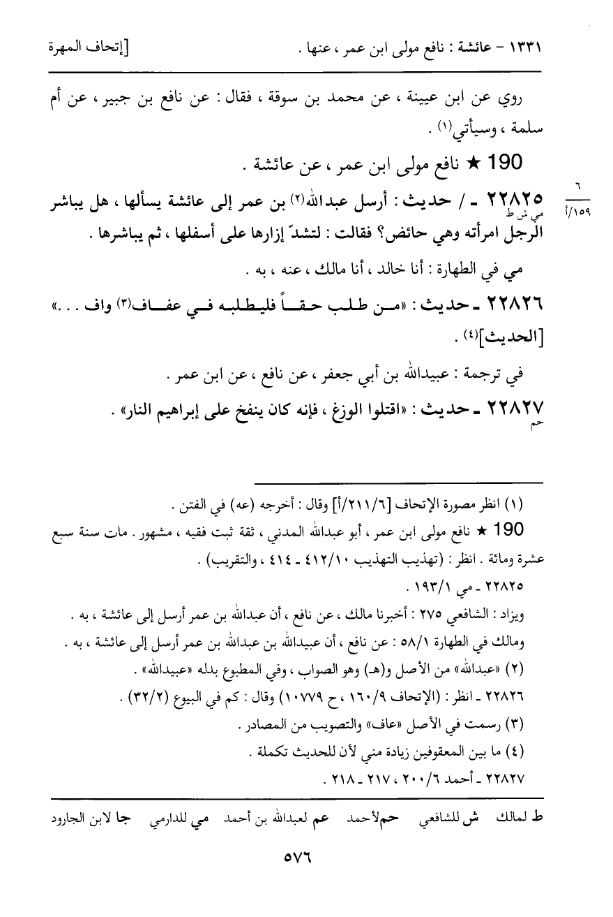22825 - حديث (مي ش ط) : أرسل عبد الله بن عمر إلى عائشة يسألها، هل يباشر الرجل امرأته وهي حائض؟ فقالت: لتشدّ إزارها على أسفلها، ثم يباشرها.