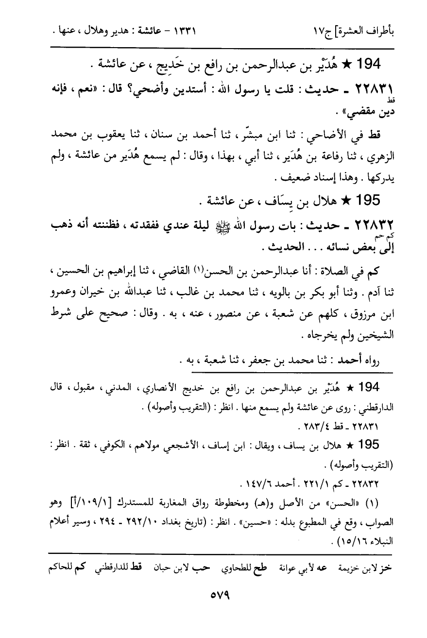 قط في الأضاحي: ثنا ابن مبشّر، ثنا أحمد بن سنان، ثنا يعقوب بن محمد الزهري، ثنا رفاعة بن هُدَير، ثنا أبي، بهذا، وقال: لم يسمع هُدَير من عائشة، ولم يدركها. وهذا إسناد ضعيف.