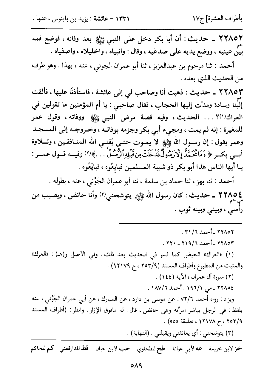 22853 - حديث (حم) : ذهبت أنا وصاحب لي إلى عائشة، فاستأذنّا عليها، فألقت إلينا وسادة ومدّت إليها الحجاب، فقال صاحبي: يا أم المؤمنين ما تقولين في العراك؟ ... الحديث، وفيه قصة مرض النبي - صَلَّى اللَّهُ عَلَيْهِ وَسَلَّمَ - ووفاته، وقول عمر للمغيرة: إنه لم يمت، ومجيء أبي بكر وجزمه بوفاته، وخروجه إلى المسجد وعمر يقول: إن رسول الله - صَلَّى اللَّهُ عَلَيْهِ وَسَلَّمَ - لا يموت حتى يُفني الله المنافقين، وتلاوة أبي بكر (وَمَا مُحَمَّدٌ إِلَّا رَسُولٌ قَدْ خَلَتْ مِنْ قَبْلِهِ الرُّسُلُ ... ) وفيه قول عمر: يا أيها الناس هذا أبو بكر ذو شيبة المسلمين فبايِعُوه، فبايَعُوه.