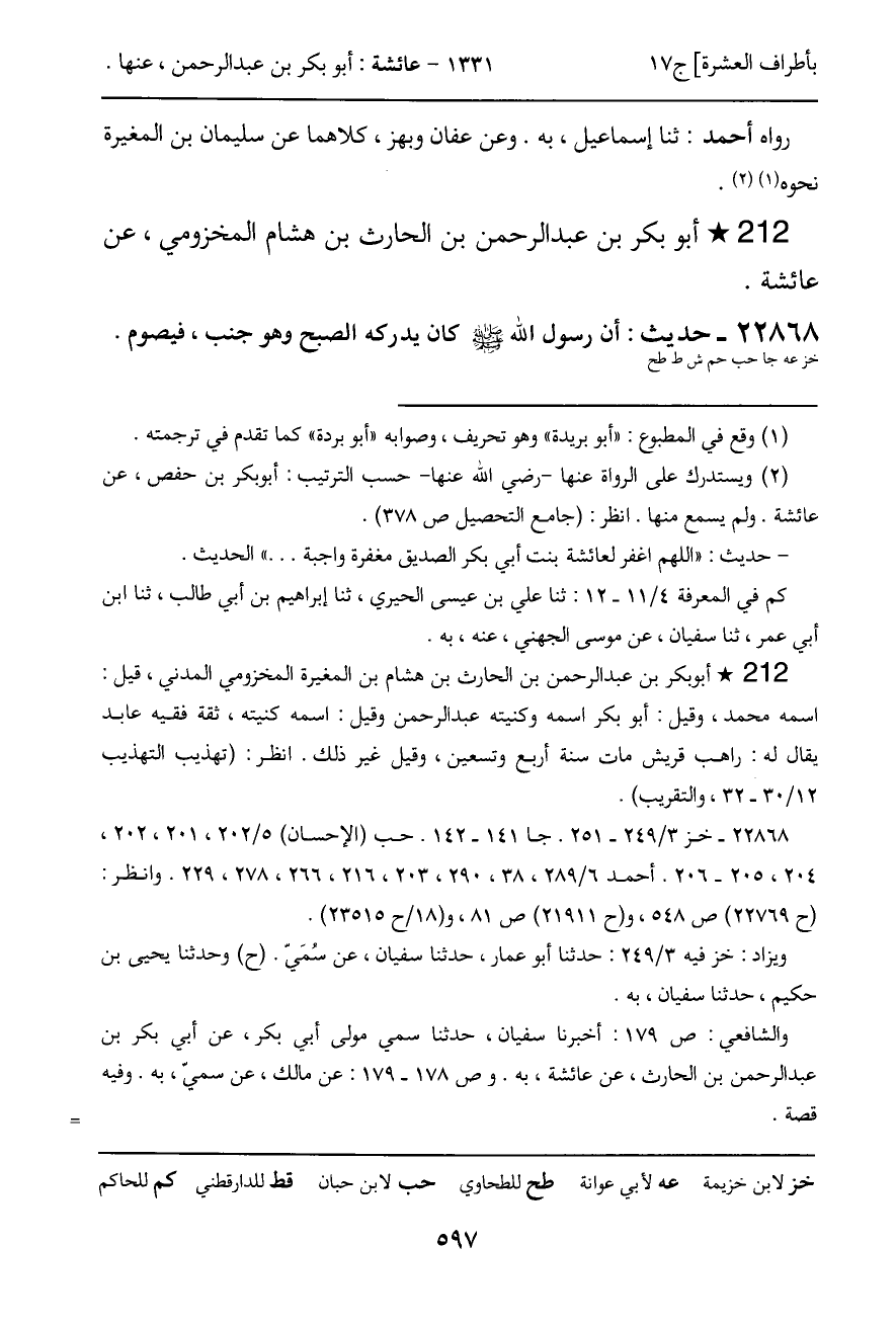 -[598]- خز في الصيام: ثنا عبد الجبار بن العلاء، ثنا سفيان، حدثني سُمَيّ، سمعه من أبي بكر: أرسل مروان إلى عائشةَ عبد الرحمن بن الحارث ... قال أبو بكر: فذهبت مع أبي، فسمعت عائشة تقول ... فذكره. وعن محمد بن بشار، عن عبد الوهاب،