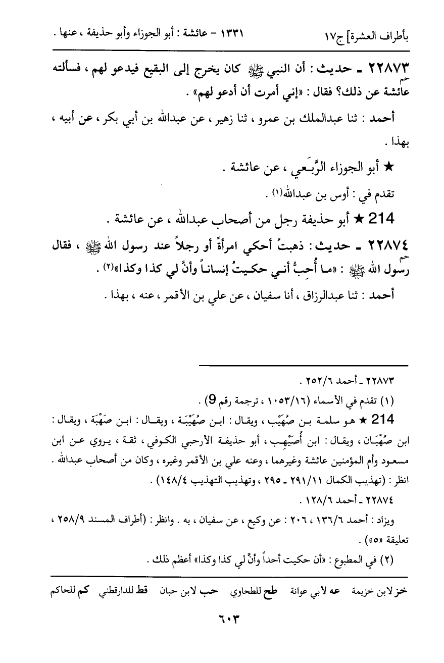 22874 - حديث (حم) : ذهبتُ أحكي امرأة أو رجلاً عند رسول الله - صَلَّى اللَّهُ عَلَيْهِ وَسَلَّمَ -، فقال رسول الله - صَلَّى اللَّهُ عَلَيْهِ وَسَلَّمَ -: "ما أُحِبُّ أني حكيت إنساناً وأنَّ لي كذا وكذا".