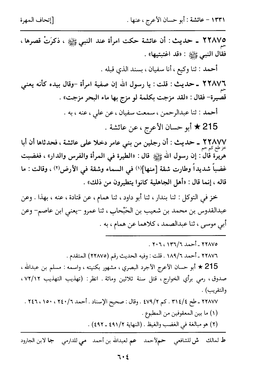 22875 - حديث (حم) : أن عائشة حكت امرأة عند النبي - صَلَّى اللَّهُ عَلَيْهِ وَسَلَّمَ -، ذكرَتْ قصرها، فقال النبي - صَلَّى اللَّهُ عَلَيْهِ وَسَلَّمَ -: "قد اغتبتيها".