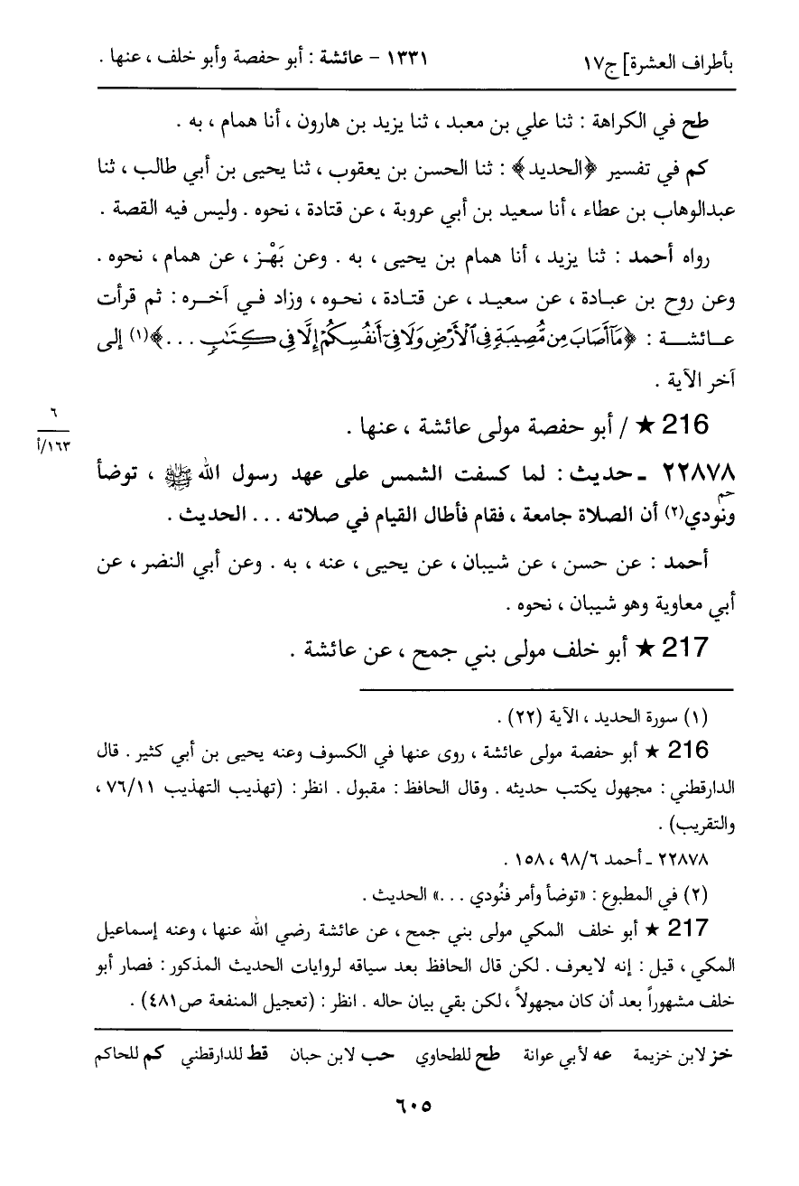 22878 - حديث (حم) : لما كسفت الشمس على عهد رسول الله - صَلَّى اللَّهُ عَلَيْهِ وَسَلَّمَ -، توضأ ونودي أن الصلاة جامعة، فقام فأطال القيام في صلاته ... الحديث.
