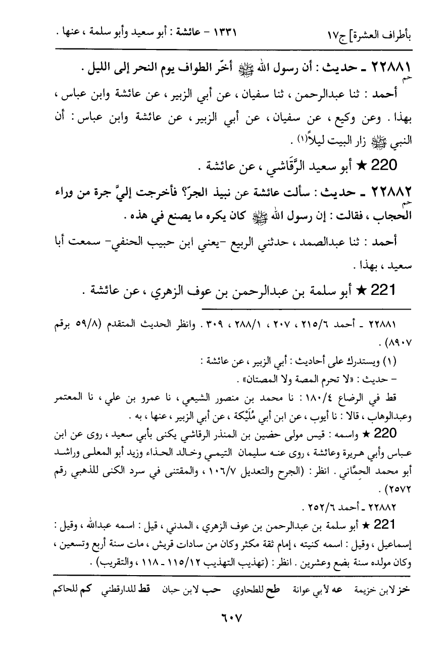 22881 - حديث (حم) : أن رسول الله - صَلَّى اللَّهُ عَلَيْهِ وَسَلَّمَ - أخّر الطواف يوم النحر إلى الليل.