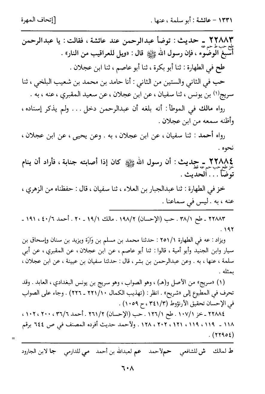 22883 - حديث (طح حب ط حم عه) : توضأ عبد الرحمن عند عائشة، فقالت: يا عبد الرحمن أسبغ الوضوء، فإن رسول الله قال: "ويل للعراقيب من النار".