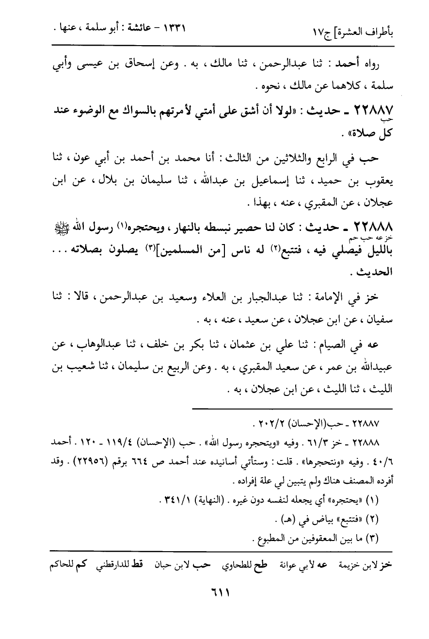 22888 - حديث (خز عه حب حم) : كان لنا حصير نبسطه بالنهار، ويحتجره رسول الله - صَلَّى اللَّهُ عَلَيْهِ وَسَلَّمَ - بالليل فيصلي فيه، فتتبع له ناس [من المسلمين] يصلون بصلاته ... الحديث.