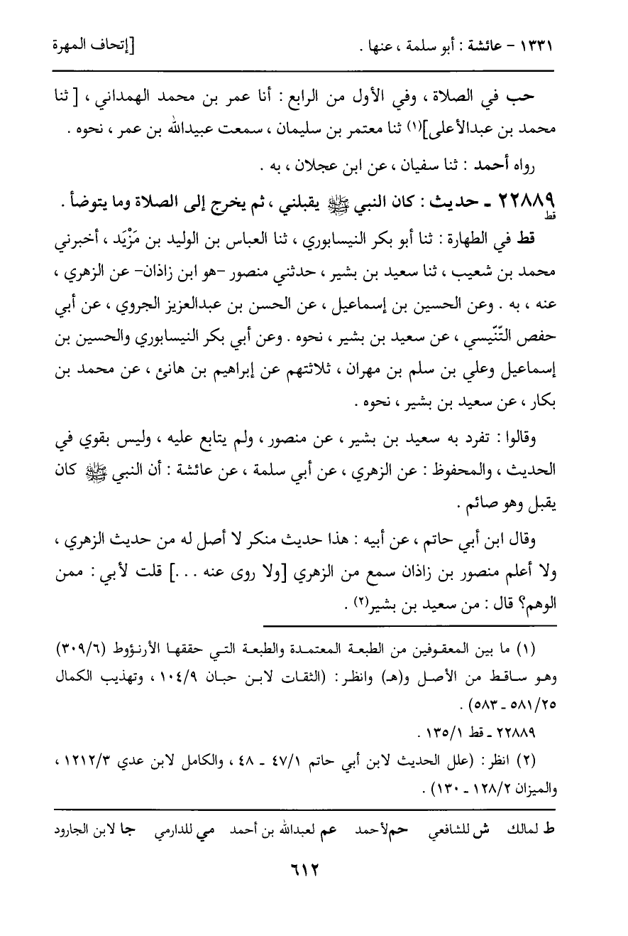 وقالوا: تفرد به سعيد بن بشير، عن منصور، ولم يتابع عليه، وليس بقوي في الحديث، والمحفوظ: عن الزهري، عن أبي سلمة، عن عائشة؟ أن النبي - صَلَّى اللَّهُ عَلَيْهِ وَسَلَّمَ - كان يقبل وهو صائم.