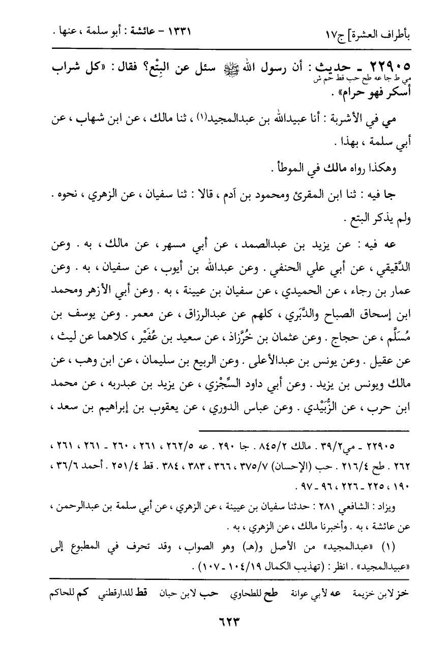 رواه أحمد: ثنا سفيان، عن الزهري، به. ولفظه: "كل شراب أسكر فهو حرام". وعن عبد الرحمن، عن مالك. وعن عبد الرزاق، عن معمر. وعن عفان، عن يزيد بن زريع، عن معمر، كلاهما عنه، به. وفيه قصة سؤالهم عن البتع.