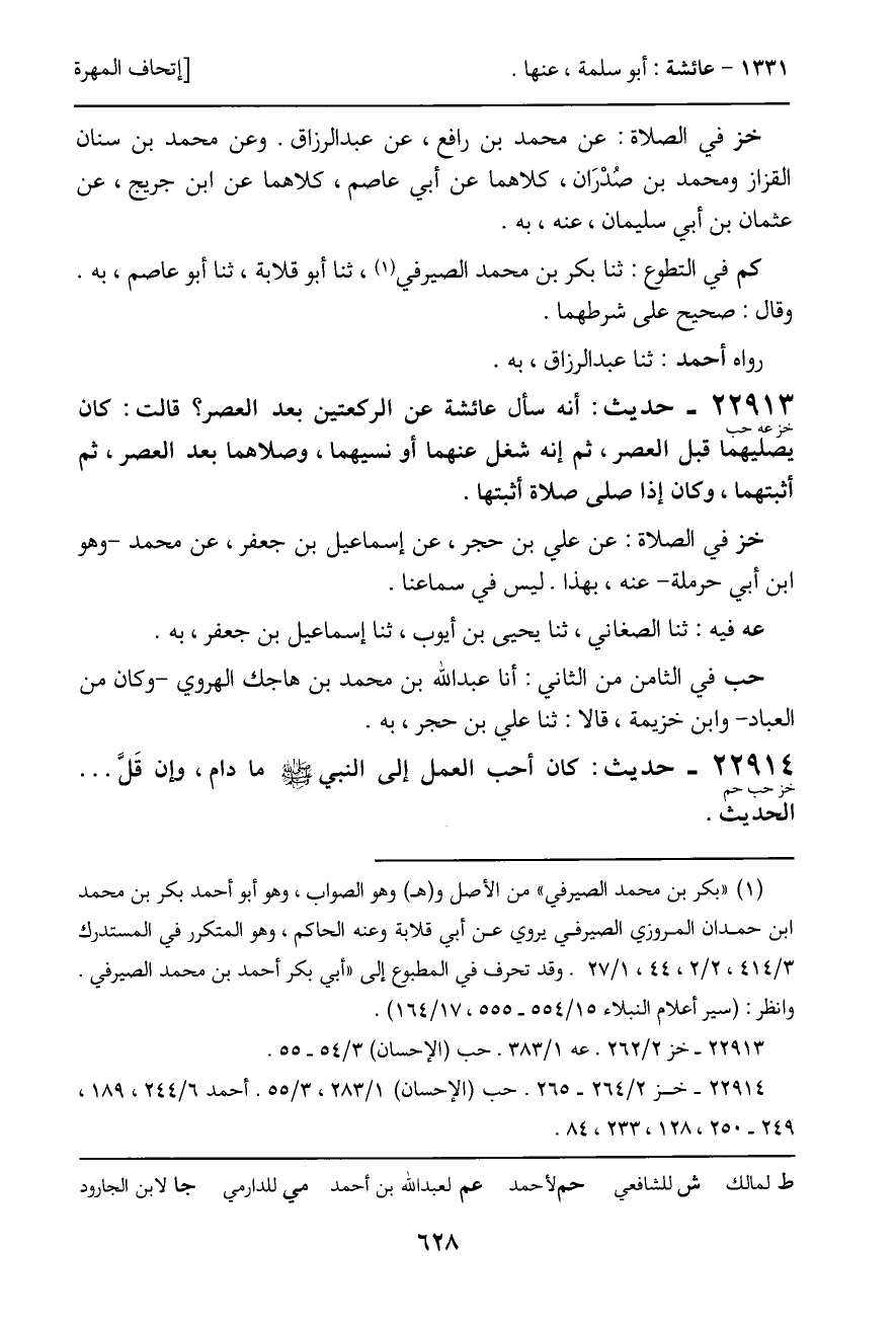 22913 - حديث (خز عه حب) : أنه سأل عائشة عن الركعتين بعد العصر؟ قالت: كان يصليهما قبل العصر، ثم إنه شغل عنهما أو نسيهما، وصلاهما بعد العصر، ثم أثبتهما، وكان إذا صلى صلاة أثبتها.