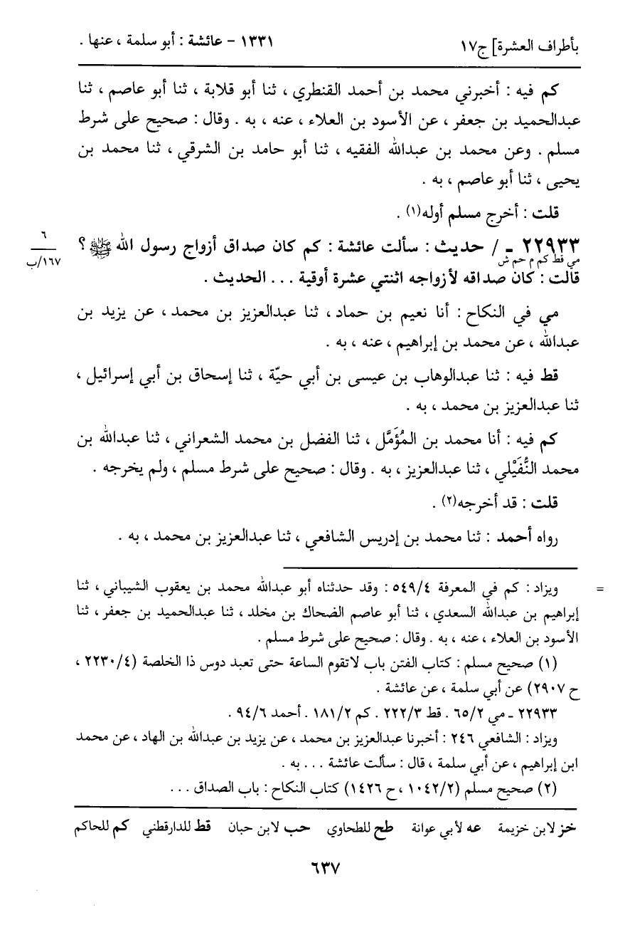 22933 - حديث (مي قط كم م حم ش) : سألت عائشة: كم كان صداق أزواج رسول الله - صَلَّى اللَّهُ عَلَيْهِ وَسَلَّمَ -؟ قالت: كان صداقه لأزواجه اثنتي عشرة أوقية ... الحديث.