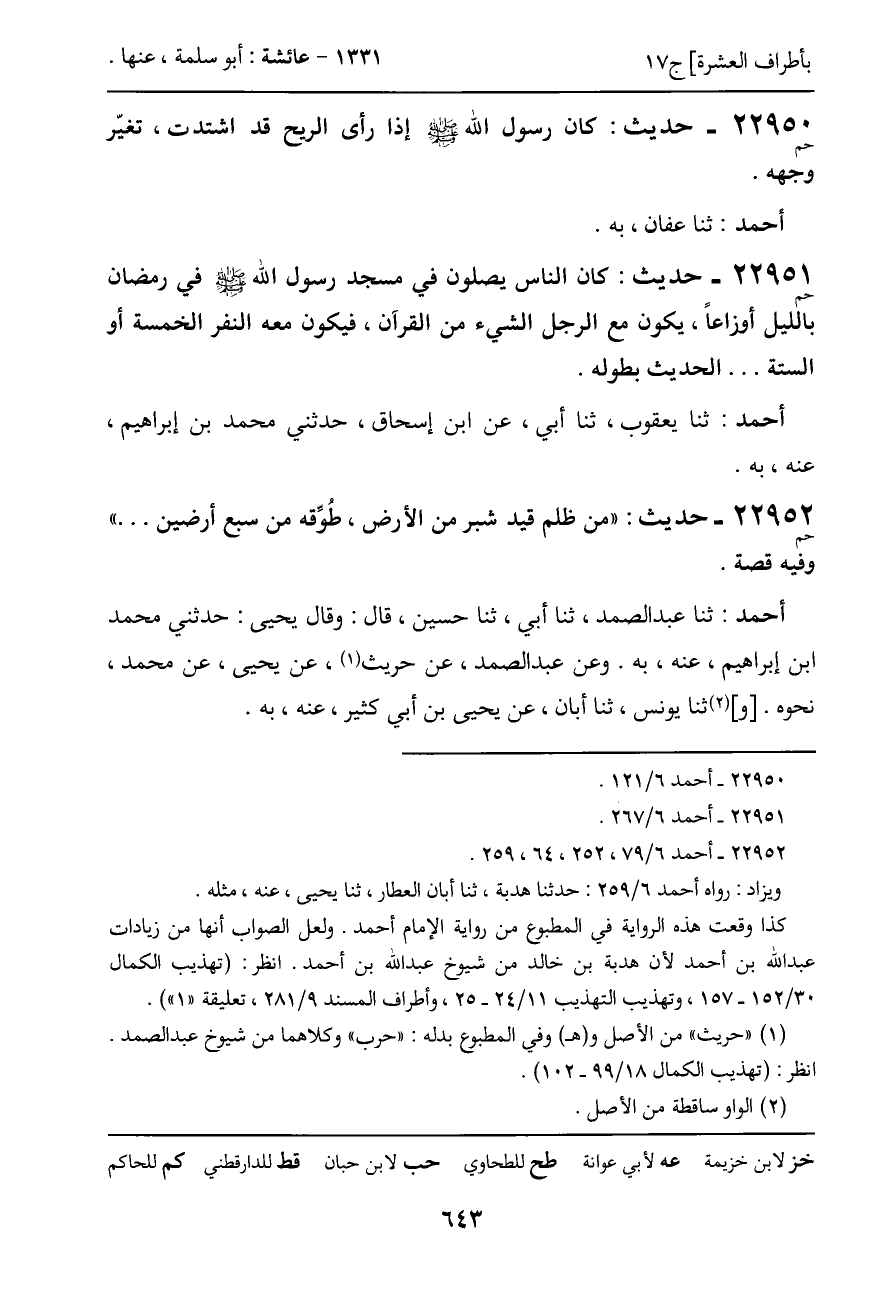 22952 - حديث (حم) : "من ظلم قيد شبر من الأرض، طُوِّقه من سبع أرضين ... " وفيه قصة.