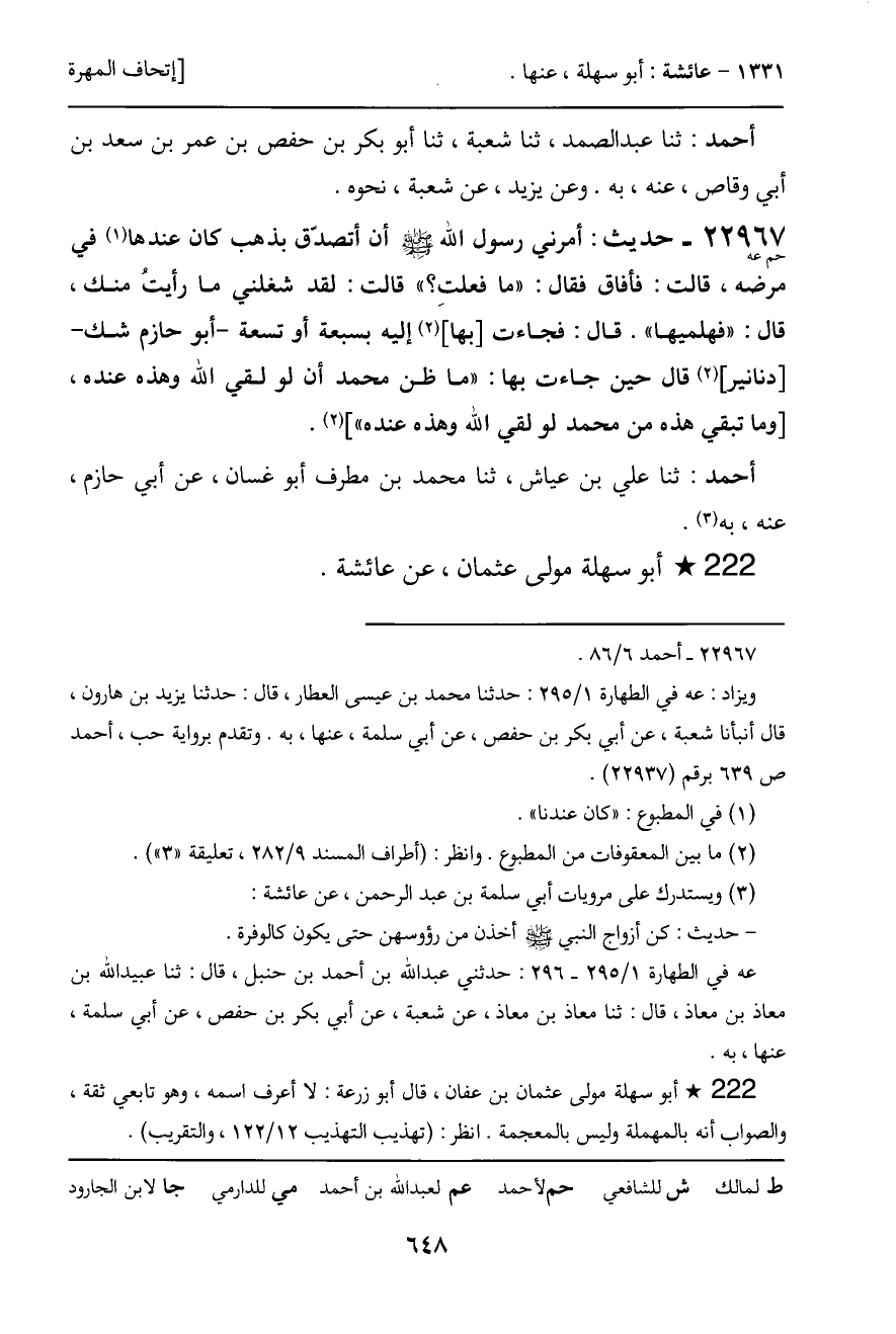 22967 - حديث (حم عه) : أمرني رسول الله - صَلَّى اللَّهُ عَلَيْهِ وَسَلَّمَ - أن أتصدّق بذهب كان عندها في مرضه، قالت: فأفاق فقال: "ما فعلتِ؟ " قالت: لقد شغلني ما رأيتُ منك، قال: "فهلميها". قال: فجاءت [بها] إليه بسبعة أو تسعة - أبو حازم شك -[دنانير] قال حين جاءت بها: "ما ظن محمد أن لو لقي الله وهذه عنده، [وما تبقي هذه من محمد لو لقي الله وهذه عنده"] .