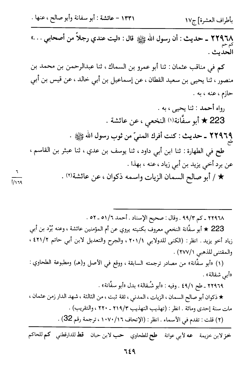 22969 - حديث (طح) : كنت أفرك المنيّ من ثوب رسول الله - صَلَّى اللَّهُ عَلَيْهِ وَسَلَّمَ -.