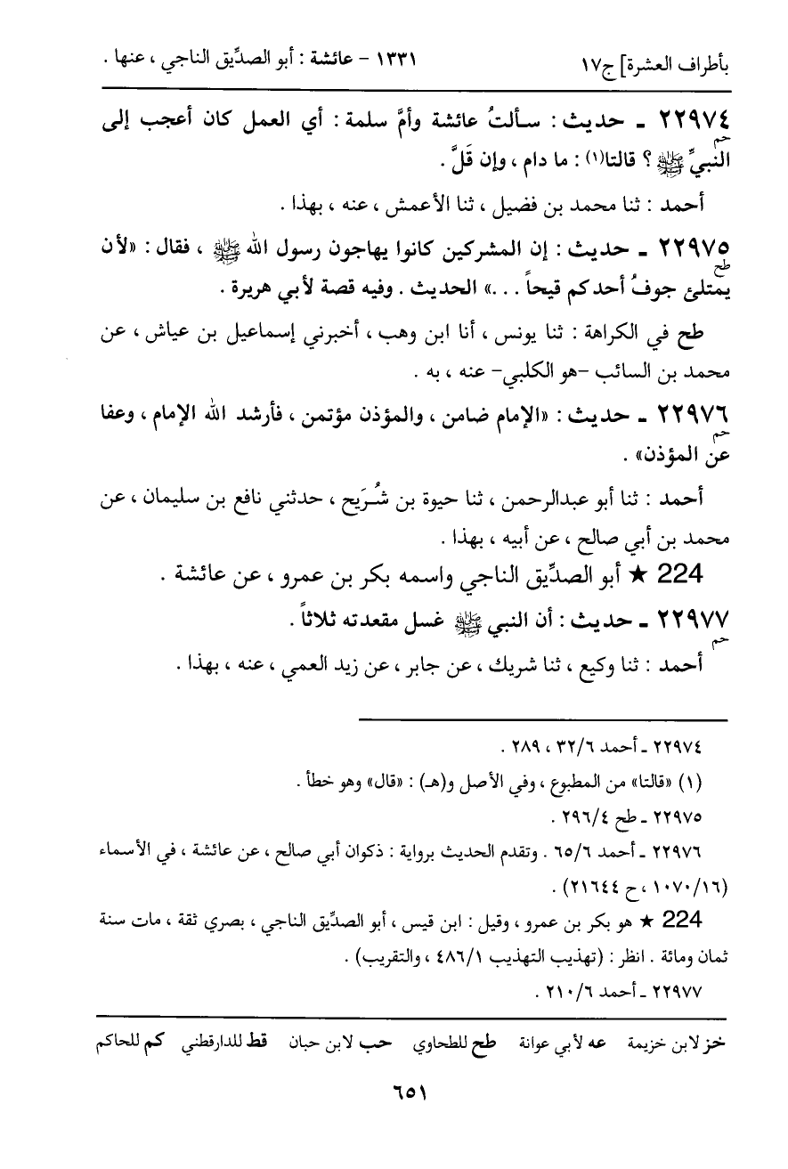 22975 - حديث (طح) : إن المشركين كانوا يهاجون رسول الله - صَلَّى اللَّهُ عَلَيْهِ وَسَلَّمَ -، فقال: "لأن يمتلئ جوفُ أحدكم قيحا ... " الحديث. وفيه قصة لأبي هريرة.