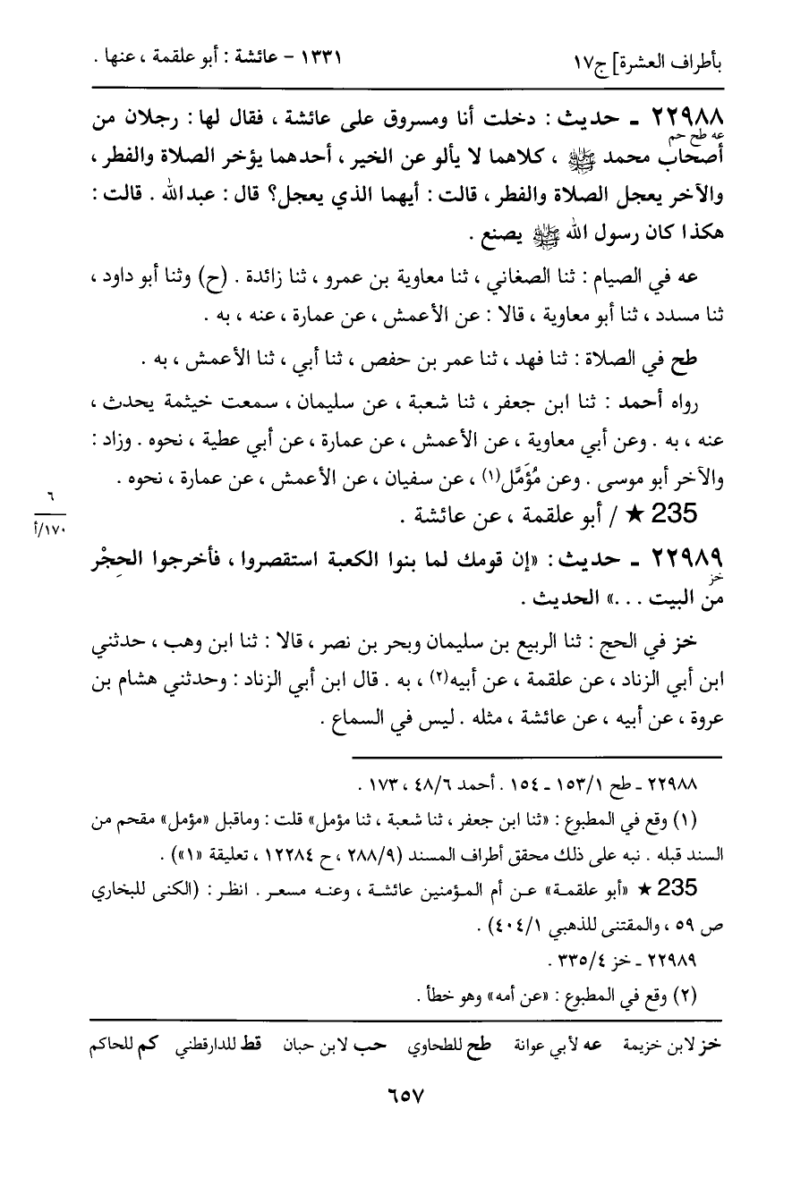 22988 - حديث (عه طح حم) : دخلت أنا ومسروق على عائشة، فقال لها: رجلان من أصحاب محمد - صَلَّى اللَّهُ عَلَيْهِ وَسَلَّمَ -، كلاهما لا يألو عن الخير، أحدهما يؤخر الصلاة والفطر، والآخر يعجل الصلاة والفطر، قالت: أيهما الذي يعجل؟ قال: عبد الله. قالت: هكذا كان رسول الله - صَلَّى اللَّهُ عَلَيْهِ وَسَلَّمَ - يصنع.