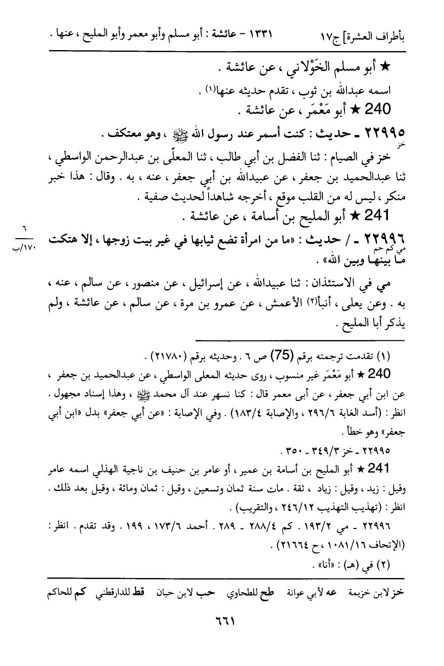 مي في الاستئذان: ثنا عبيد الله، عن إسرائيل، عن منصور، عن سالم، عنه، به. وعن يعلى، أنبأ الأعمش، عن عمرو بن مرة، عن سالم، عن عائشة، ولم يذكر أبا المليح.